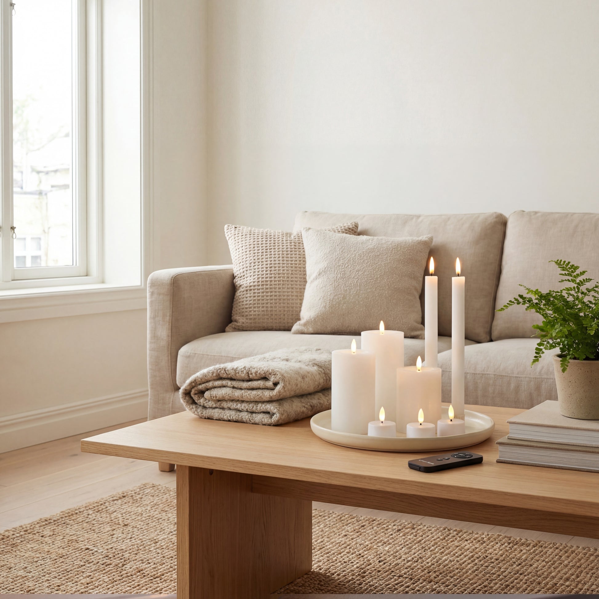 Bloklys og stagelys har en rustik overflade og er belagt med ægte stearin, hvilket giver et flot og autentisk look – helt uden sod, brandfare eller varme.