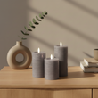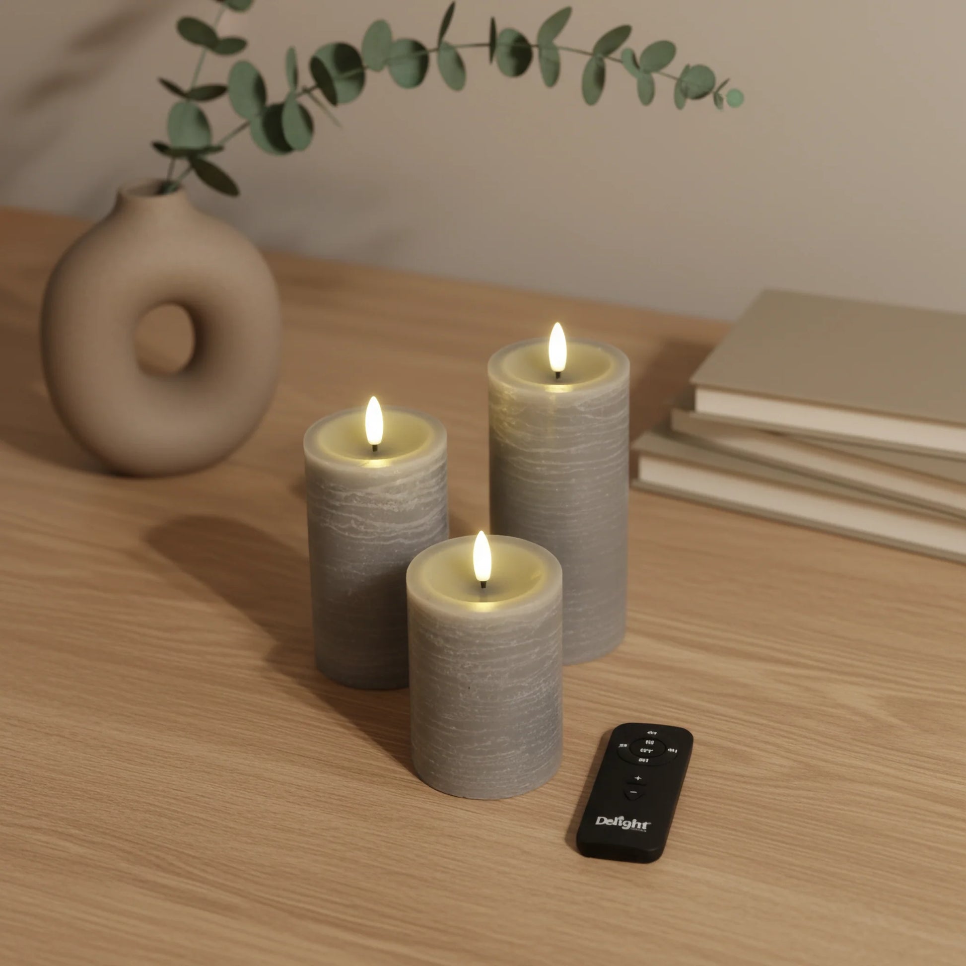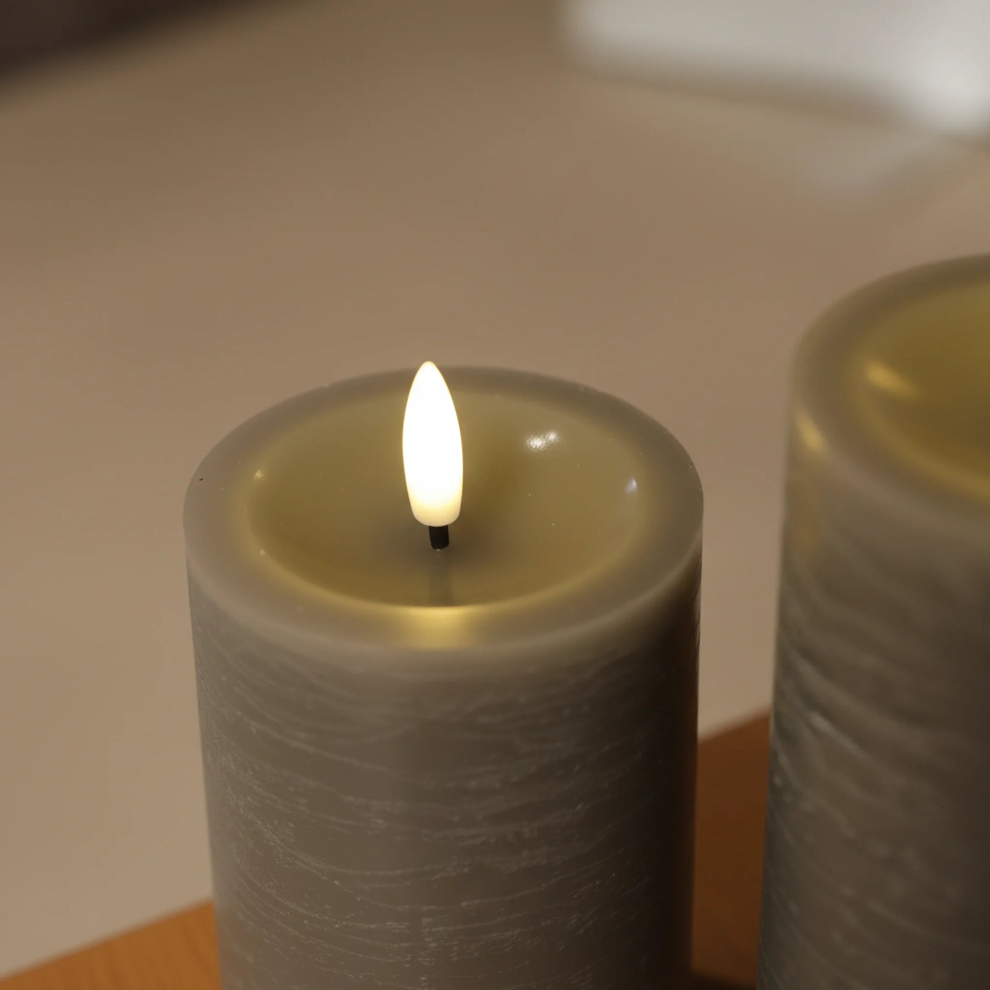Skab en varm og eksklusiv stemning i hjemmet med denne 3-pak LED bloklys i farven grå. Lysene har en rustik overflade i deluxe-kvalitet, som giver dem et autentisk og dekorativt udtryk. Med ægte voks og realistisk LED-flamme får du æstetikken fra rigtige stearinlys – helt uden brandfare eller stearinrester.