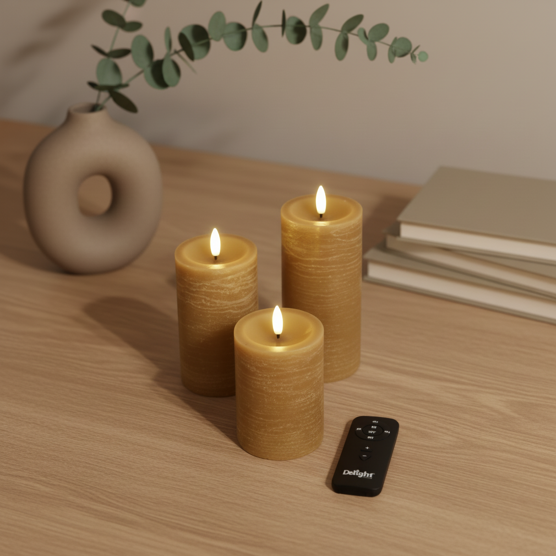 Skab en varm og eksklusiv stemning i hjemmet med denne 3-pak LED bloklys i farven karry. Lysene har en rustik overflade i deluxe-kvalitet, som giver dem et autentisk og dekorativt udtryk. Med ægte voks og realistisk LED-flamme får du æstetikken fra rigtige stearinlys – helt uden brandfare eller stearinrester.