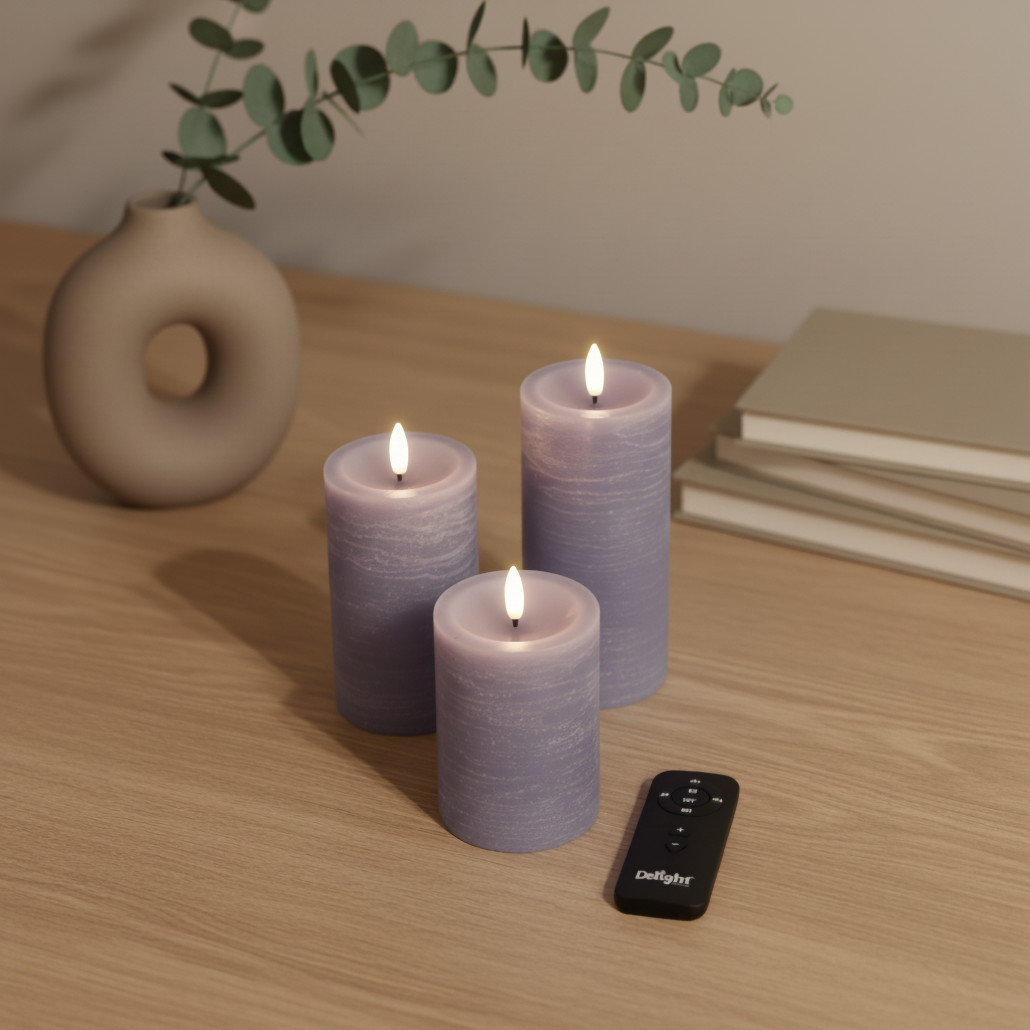 Skab en varm og eksklusiv stemning i hjemmet med denne 3-pak LED bloklys i farven Lavendel. Lysene har en rustik overflade i deluxe-kvalitet, som giver dem et autentisk og dekorativt udtryk. Med ægte voks og realistisk LED-flamme får du æstetikken fra rigtige stearinlys – helt uden brandfare eller stearinrester.