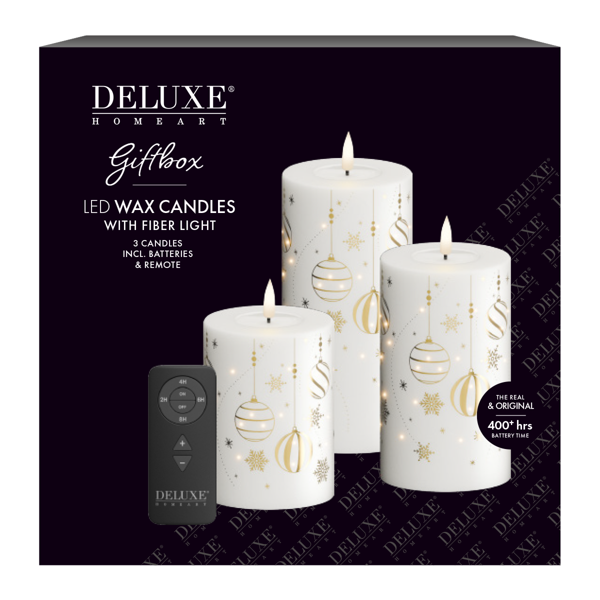 LED Jule Bloklys 3 stk. – Deluxe Homeart gaveæske inkl fjernbetjening og batteier (guldprint)