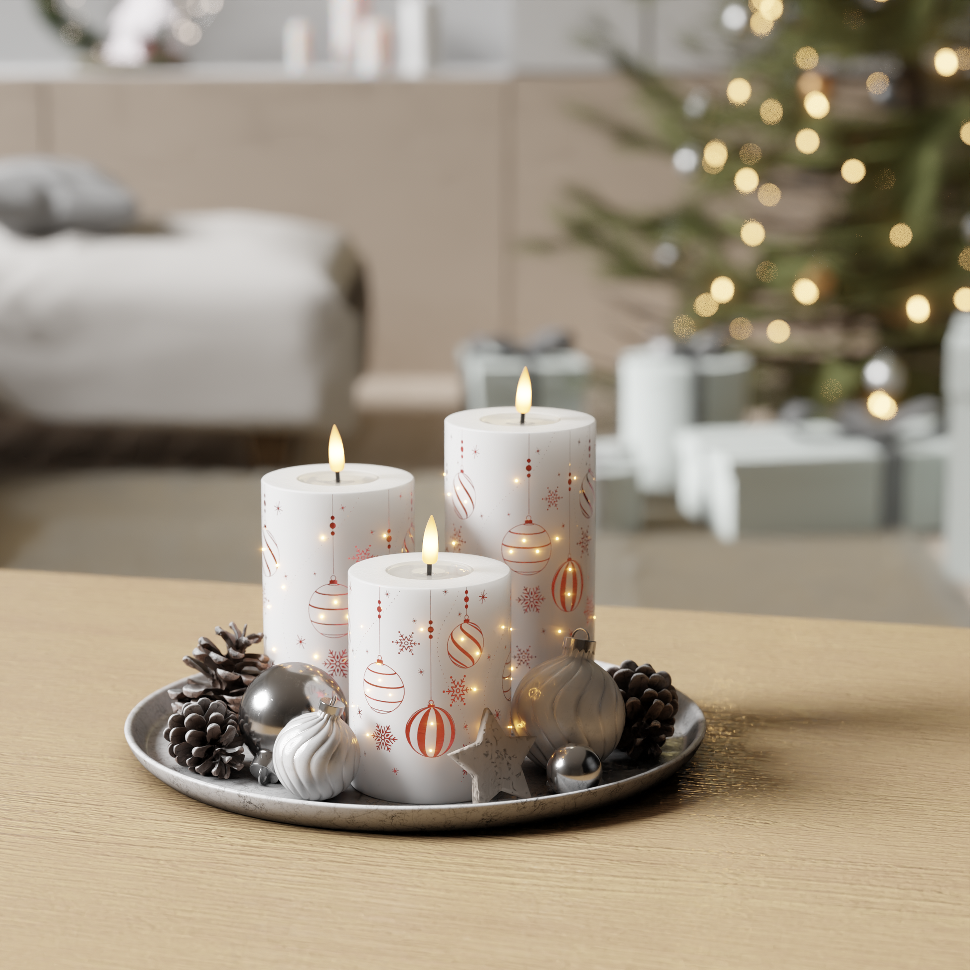 LED Bloklys 3 stk. – Gaveæske - Rød print fra Deluxe Homeart inkl. fjernbetjening
