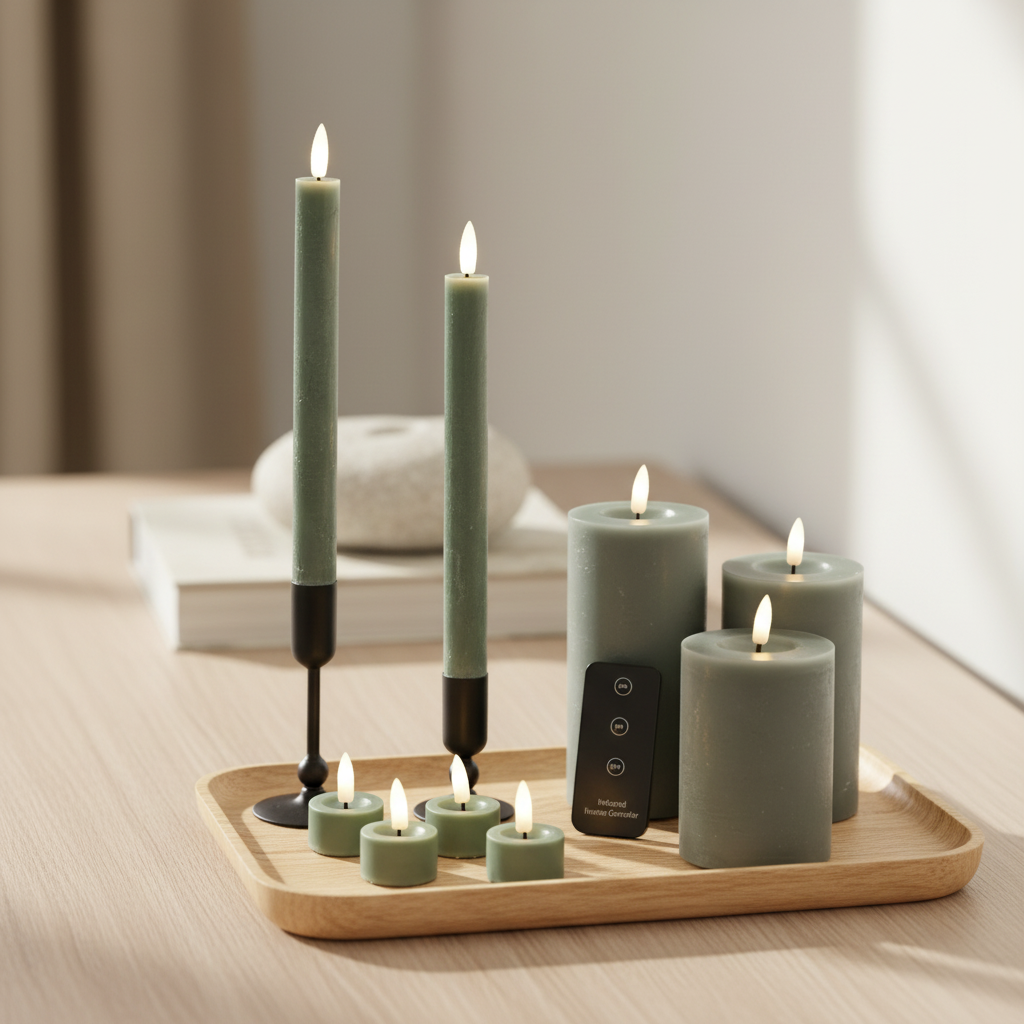 Stort LED-stearinlyssæt med 9 lys og fjernbetjening - Grøn