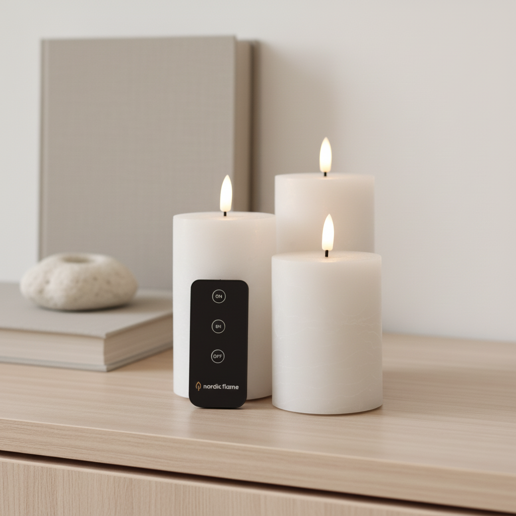 Skab den perfekte atmosfære i dit hjem med vores Nordic Flame LED-lys. Vores 3-pack bloklys leveres med fjernbetjening, så du nemt kan styre lysene og tilpasse belysningen efter dine behov. Disse lys har en realistisk 3D-flamme og et rustikt finish, der tilføjer charme til ethvert rum. De er også naturtro med en flot livagtig 3D flamme hvilket får dem til at ligne ægte stearinlys. Bestil din 3-pack i dag og skab hygge og stemning i dit hjem.