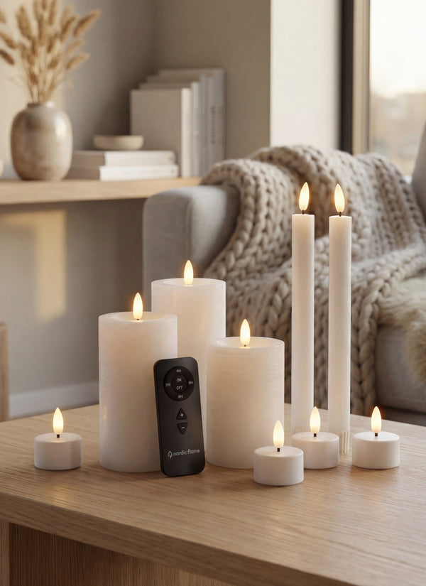 Den medfølgende Nordic Flame fjernbetjening giver dig fuld kontrol over alle lysene i sættet.